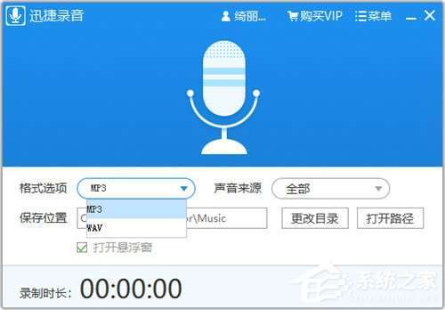 2、除了音频格式之外,还能在旁边的“声音来源”选项中选择系统声音或者麦克风声音又或者两者都有。
