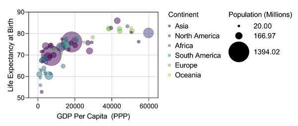 在此图上,超过100个国家/地区显示为单个圆圈。每个圆圈的X坐标代表该国的GDP(PPP),而Y坐标代表出生时的平均预期寿命。每个符号的大小与其所代表的国家的人口成比例(两个最大的符号分别代表中国和印度)。最后,每个符号的颜色代表该国家所在的大陆。在这种情况下,此最终变量(颜色)是分类变量,但气泡图中的颜色也可以由连续变量定义:在该图中,符号的X坐标,Y坐标和大小与以前相同。但是,现在该符号的颜色连续不断地代表该国家每1000个人的出生率。棱镜现在还具有内置的半透明配色方案,以便可以更清晰地看到重叠的符号。