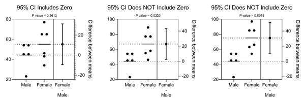 在测试中执行,Prism现在将自动创建结果的估计图。在此图上,两组的原始数据都将绘制在左侧的Y轴上。在右边的Y轴上,将绘制组均值的差及其95%置信区间。该可视化提供的信息比单独的P值还多,因为它不仅显示了95%CI是否包含零(如果95%CI包含零,则P值将大于0.05;它还显示了95%CI的宽度)。如果95%CI不包括零,则P值将小于0.05)