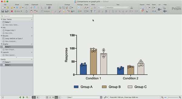 只需执行多个成对比较的适当分析即可。然后单击一次以将这些结果自动添加到图形中。要自定义这些行和星号,只需再次单击工具栏按钮。调整数据或分析,图形上显示的结果将自动更新。但是请记住,P值只是故事的一部分。别忘了报告效果估算值(例如,均值差异为95%置信区间!)