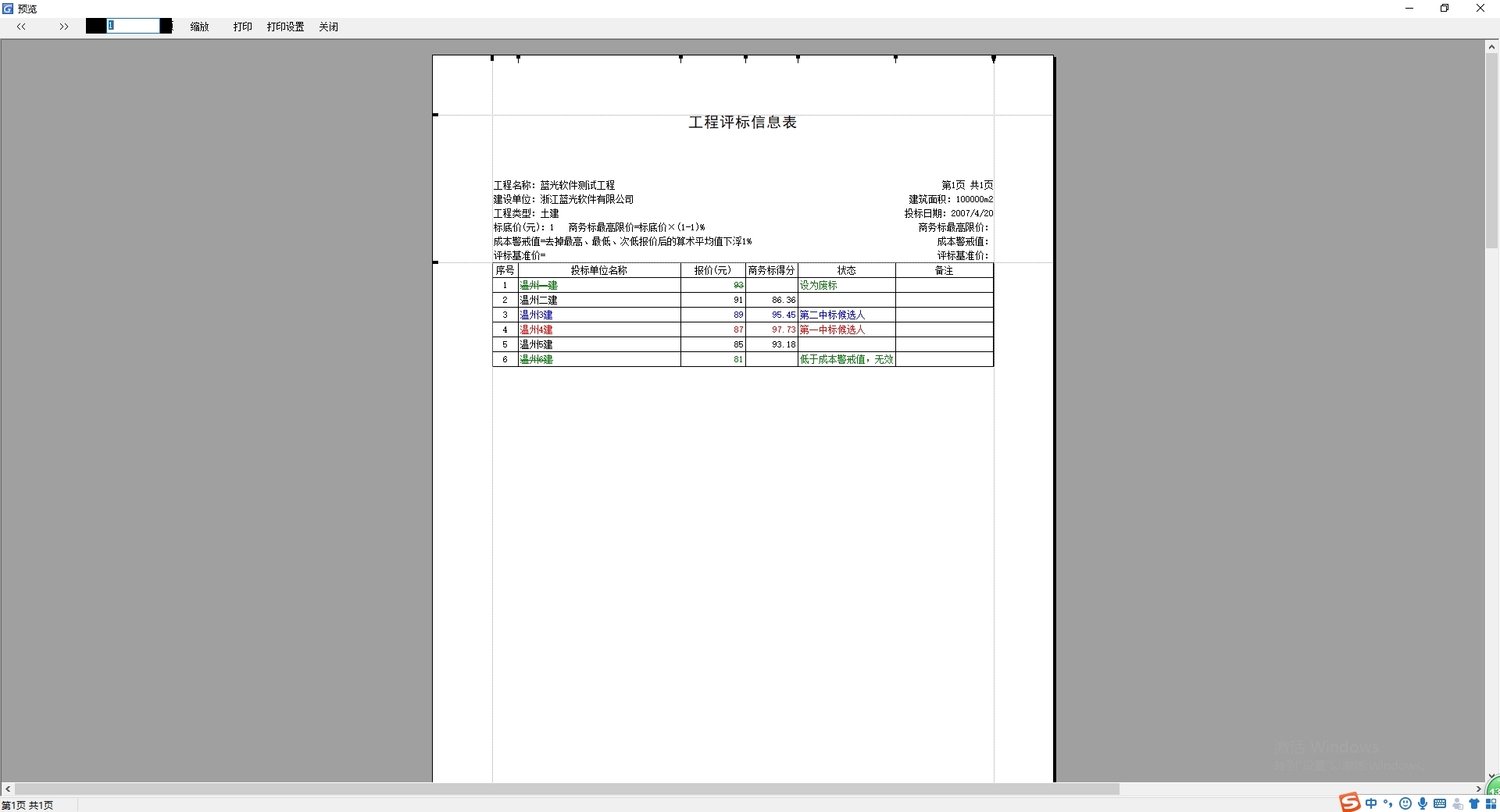 打印预览,用户可以快速查看工程评标信息表,并对打印参数进行自定义设置。