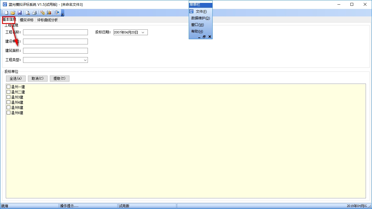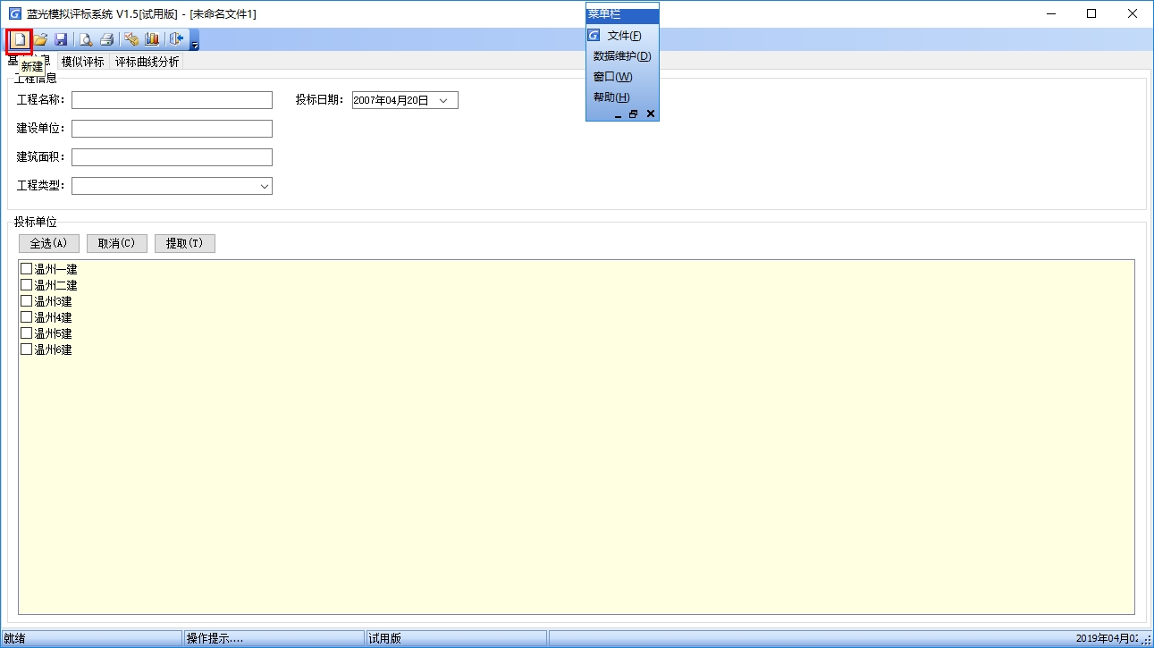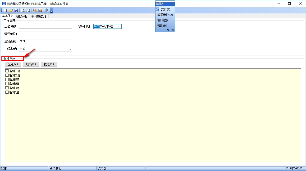 4、在投标单位一栏下用户可以根据需要选择投标的单位,点击菜单栏上的【数据维护】按钮,在【投标单位】选项下可以添加投标单位。
