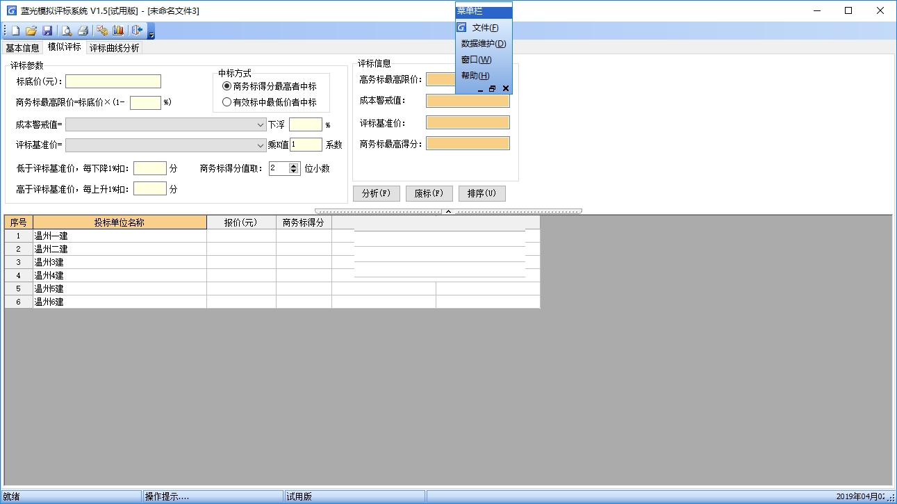 本软件用于预测工程报价是否能够以最大概率中标,或者多家单位串标时,保证我方的代表单位可以中标。本软件评标方法固定方法: