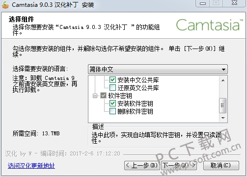 3.选择简体中文,把“界面语言”“素材库”都点上,选择“安装简体中文版”“安装中文公共库”。可以在往下拉看到“软件密钥”这里可以选择“安装软件密钥”,可以自动破解,但是小编安装的时候并没有破解成功,有的用户就自动破解成功了,如果没有破解成功,还需要重新安装这个补丁,来选择“删除软件密钥”这个选项,要不然用注册机来破解的话会出错。如果这时候你已经破解了,那下面的教程就不需要看了,可以享受使用了。都选择好后,点击“下一步”,补丁会自动检测CamtasiaStudio9的安装地址,如果没有检测出来,请收到选择上安装CamtasiaStudio9的安装目录。