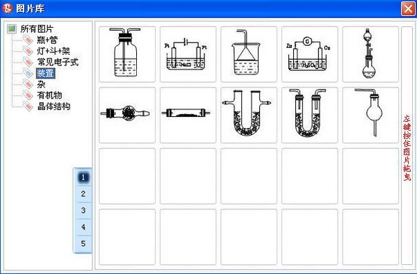 6化学图库——您可以将图库中的图片拖放到word中任意位置,即可在鼠标所在位置插入拖放图片,从而方便用户组装实验仪器图、有机结构图等;另外,化学图库功能还支持用户向图库自定义添加、删除图片等。