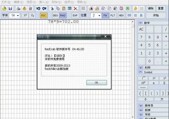 4.RedCrab科学计算器允许用户在编辑器中输入数学表达式,对于一些数学上专用的特殊符号,可以从软件自带的符号库中查找并输入,比如根 号、开方、分数等等。
