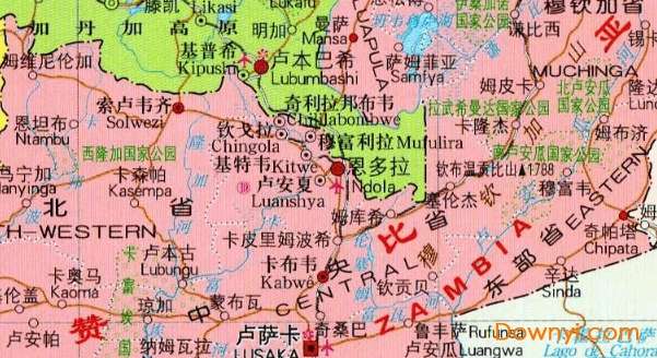 首都卢萨卡(lusaka),赞比亚首都和最大城市,人口310万。位于国土中南部高原上,平均海拔1280米。由于赞比亚系一盛产铜矿的内陆国,卢萨卡有铁路通往邻国坦桑尼亚以运铜出口,而有“铜都”之誉。