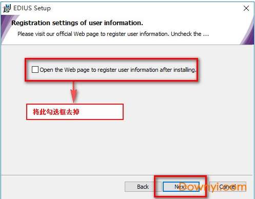 5、进入到edius pro8软件附加选项界面,我们可以将界面中勾选的选项去掉之后,再点击下面的“next”选项。