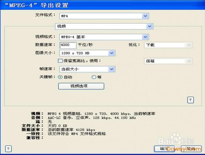 4、进入到mp4到处设置界面,我们可以设置文件格式、数据速率、图小大小、帧速率等选项,设置完成后我们再点击确定。