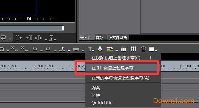 1、首先我们需要先打开edius pro 8软件,然后将需要加字幕的素材添加到软件中,接下来我们点击界面中的“t”图标,然后在下拉的选项中点击在点击“在1t轨道上创建字幕”选项。