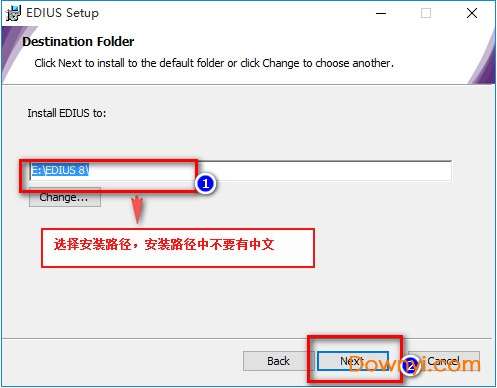 4、进入到edius pro8软件安装位置选择界面,我们可以默认安装到c盘或者点击界面的“change”选项,选择合适的安装位置。这里需要注意的是安装路径不要有中文,选择完成后我们点击下方的“next”选项就可以进入下一步。