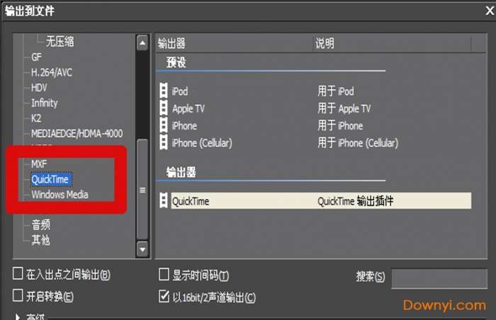 2、进入到edius pro 8软件输出界面,如下图所示,我们在界面左侧的选项列表中找到“quicktime”选项,然后点击该选项。