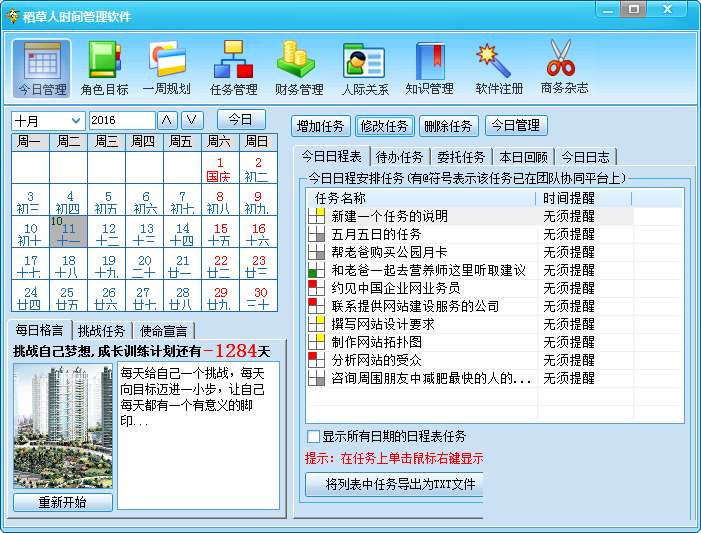 4、进入软件主界面,包括了今日管理里面的日历,每日格言、增加任务;