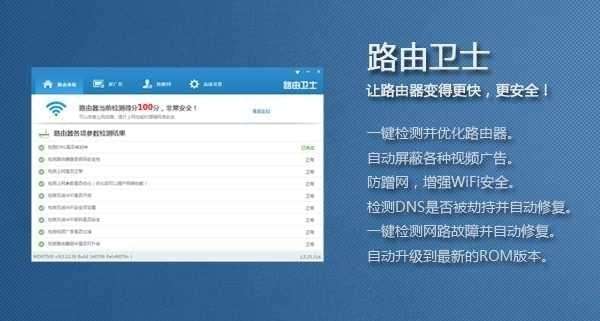 路由卫士是一款极其简单的路由器设置管理软件,其主要功能是一键设置优化路由、屏蔽视频广告、防蹭网、路由器全面检测及高级设置等功能。