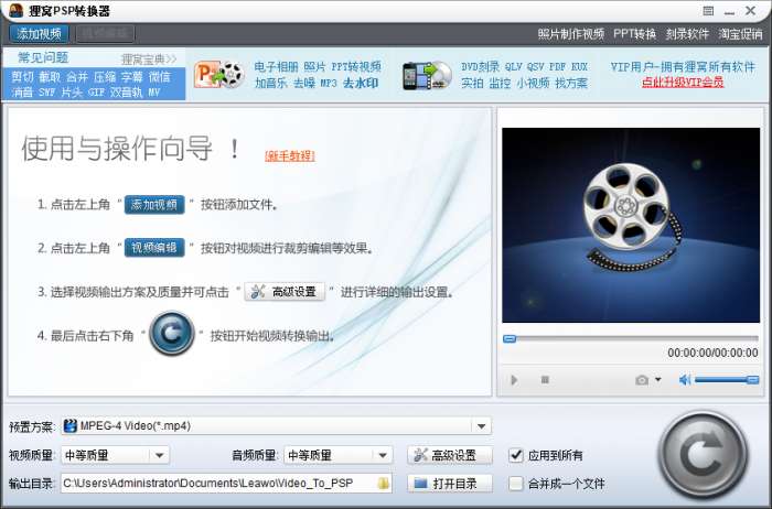 狸窝超级PSP转换器官方版是一款好用的视频转换工具。狸窝超级PSP转换器最新版时提供视频编辑功能,随意获得自己需要的视频。在狸窝超级PSP转换器官方版中可以对输入的视频文件进行可视化编辑:裁剪视频,截取部分视频转换,不同视频合并成一个文件输出,调节视频亮度,对比度等。
