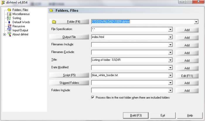 dirhtml官方版是一个专业的图形界面的制作文件目录HTML页面的工具。dirhtml最新版可以制作文件和图片的列表,可以用html文件的标题作为链接名称,还可以修改页面原代码,可以说是一个HTML文件管家。而且dirhtml官方版非常小巧,简单实用,支持批量创建文件索引网页。