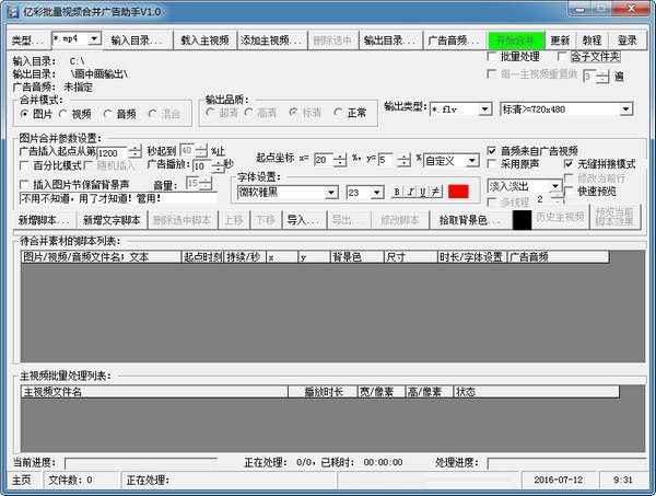 亿彩批量视频合并广告助手官方版是一款视频广告合并软件。亿彩批量视频合并广告助手最新版功能丰富多样,又实用强大,可以支持设置合并模式,输出品质等功能。亿彩批量视频合并广告助手官方版主要用于将文字、图片、音频、视频单项或者组合成脚本列表之后,以画中画形式融合嵌入到主视频中。