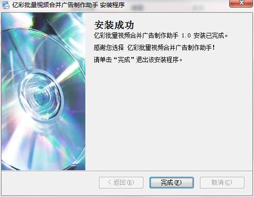 7.点击完成,亿彩批量视频合并广告助手软件安装成功