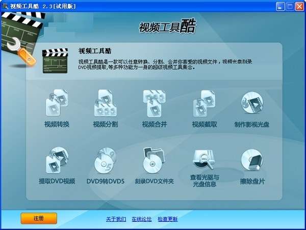视频转换、视频分割、视频合并、视频截取、制作影视光盘、提取DVD视频、DVD9转DVD5