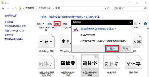 2.选中想要卸载的字体,点击删除,选择是即可。