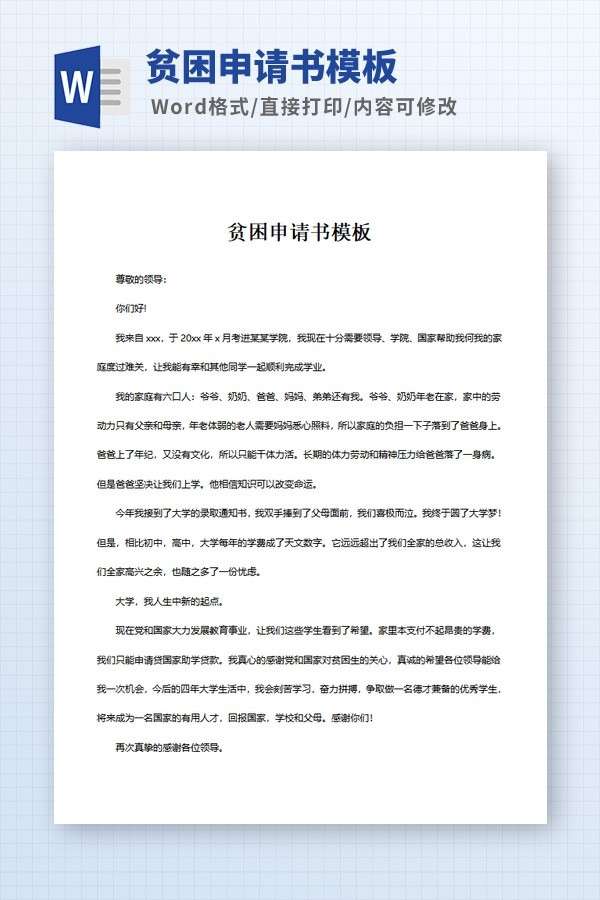 贫困申请书模板是用来规范贫困生写资助申请书所提供的范本模板。贫困申请书模板由PK游戏网为您提供免费下载,源文件为Word格式模板,大家可以直接下载源文件,以便于修改内容。