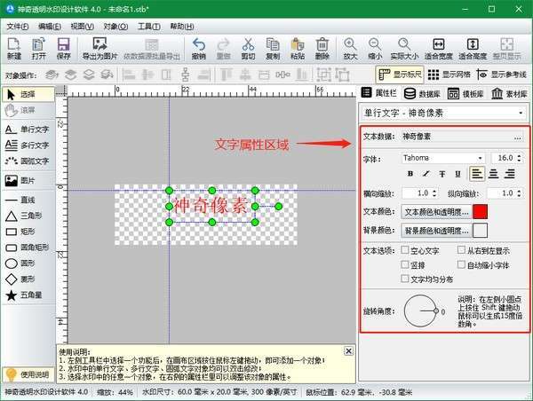 软件界面主要由标题栏、操作按钮区域、工具栏、透明水印编辑区域、属性栏、模板库、素材库、缩览图等区域构成。其中最常用的是工具栏、属性栏和透明水印编辑区域。