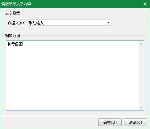 首先添加单行文字“神奇像素”,点击左侧“单行文字”,然后在透明水印编辑区域中任意位置点击鼠标左键,默认弹出文字输入框,输入想要修改的文字内容,点击确定即可完成修改。如图: