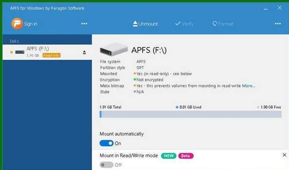 第三方开发人员经常会填补这一空缺,比如Paragon Software的APFS for Windows。这个小而强大的应用程序在Windows中的本机NTFS文件系统和为macOS 10.12(和更新版本)创建的现代APFS文件系统之间提供必要的转换。通过允许Windows计算机本地读取和写入APFS格式的驱动器,实际上没有生产力限制。无论底层操作系统如何,都可以在一种类型的设备上启动,保存,然后在另一种设备上编辑或完成工作。这对于可能使用安装了不同操作系统的不同设备来完成项目的协作团队尤其有用。
