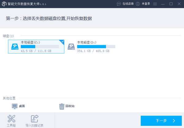 二、打开软件,遵循软件引导进行数据恢复,首先选择丢失的数据磁盘位置然后点击下一步。