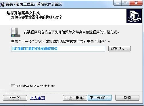 4、选择开始菜单文件夹,默认文件夹“老鹰工程量计算薄软件公益版”,点击下一步;