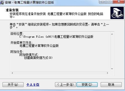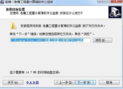 3、选择目标位置,默认位置“C:Program Files (x86)老鹰工程量计算薄软件公益版”,建议安装D盘,点击下一步;
