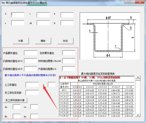 圆筒状拉伸零件展开计算工具需要输入的相关参数有凸缘直径、零件薄壁厚度、圆筒状拉深件高度、凸缘与圆筒相交处的圆弧半径、圆筒直径、以及圆筒底部半径等。可计算出的相关参数有产品展开后的直径、坏件展开直径、凸缘相对直径、材料相对厚度、产品相对高度等。