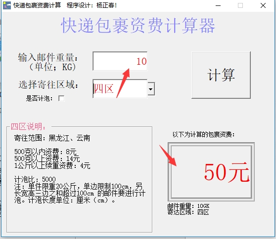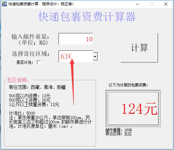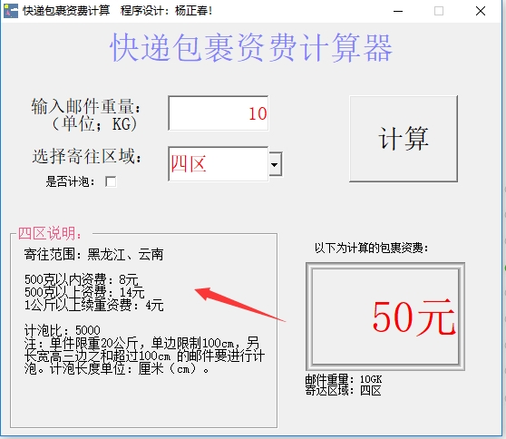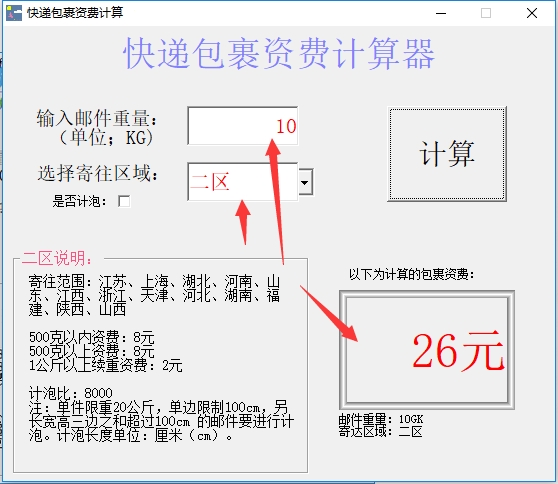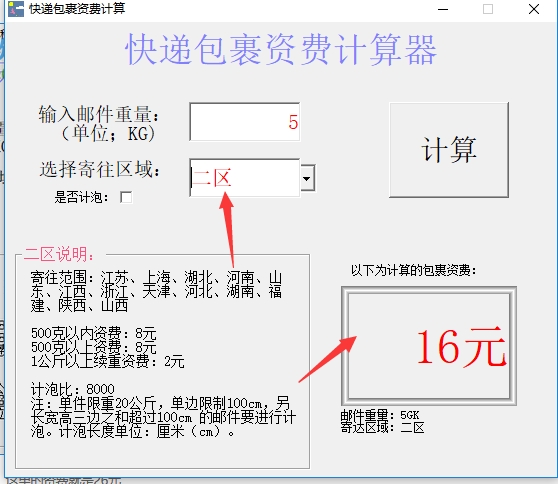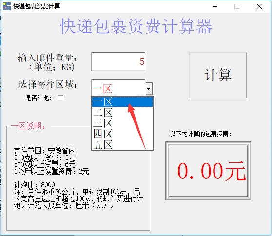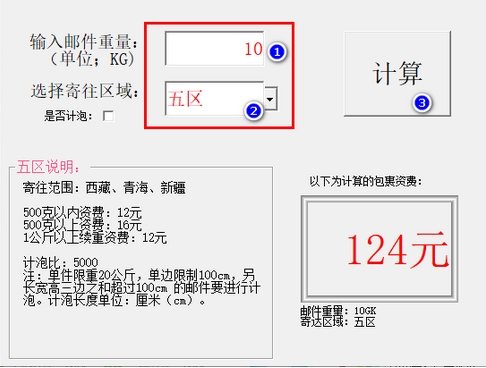 10、只要简单输入邮件重量,选择寄往区域,就可以轻松算出包裹资费