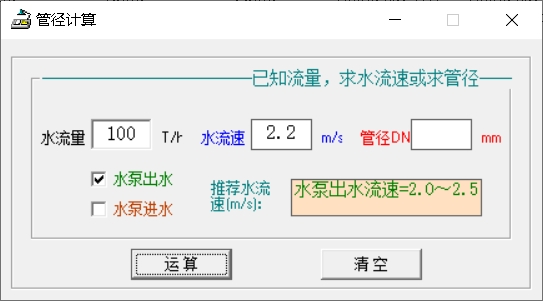 管径计算软件最新版是一款十分优秀的计算工具,管径计算软件最新版体积小巧,计算简单,可以根据水流量、水流速计算管径,计算水泵出水、水泵进水,即已知流量,求水流速或求管径,不仅如此,管径计算软件官方版还支持直接调用,不需要用户朋友自己重新计算。非常的方便。