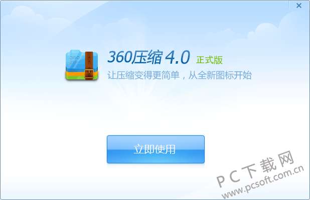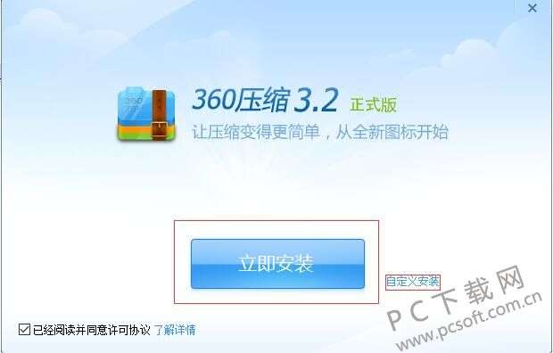 1、从PC下载网下载360解压缩软件后,在本地得到一个.exe文件,双击.exe文件进入360压缩安装导向,用户可以直接点击【立即安装】,360压缩会默认安装,或者点击【自定义安装】。