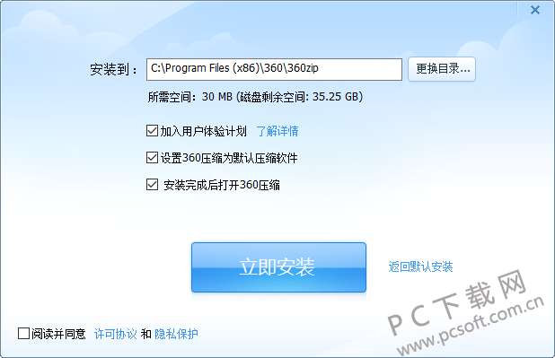 2、点击【自定义安装】后,会弹出一个新的界面,点击【更改目录】选择360压缩软件的安装位置,用户可以更具自己的需求来选择是否勾选“加入用户体验计划”、“设置360压缩为默认压缩软件”和“安装完成后打开360压缩”,并且勾选“阅读并同意许可协议和隐私保护”复选框,选择完成后,点击【立即安装】。