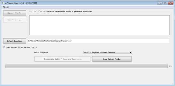 确认 Output Location 转成字幕后储存的位置是不是你想要,预设为桌面的 pyTranscriber 资料夹。都好了之后,就按下方 Transcribe Audio / Generate Subtitles 开始转换: