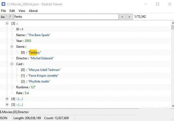 Dadroit是从零开始制作的,有一个重要的目标,即表现。我们通过将JSON视为数据格式而不是纯文本来实现此目标。一切都是定制的,以实现它,结果是惊人的:在几秒钟内打开一个千兆字节的文件。