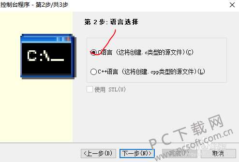 5、选择您要编写程序的语言,C语言或者c++语言,您根据您要写的程序选择。选项完成后点击【下一步】。