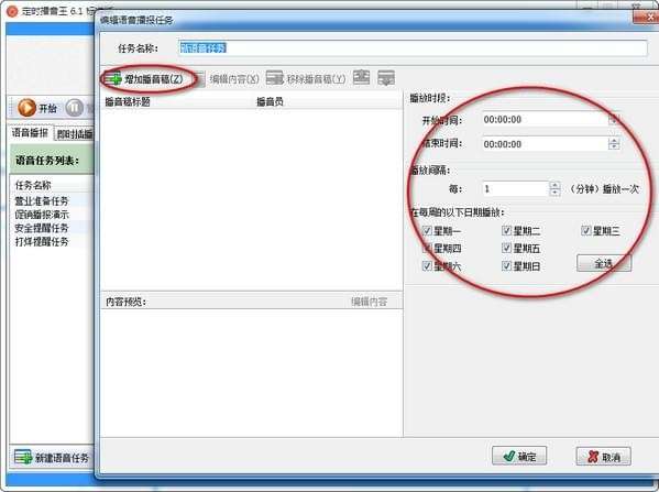2、添加播音稿,设置播放时段、播放间隔和每周播放日期