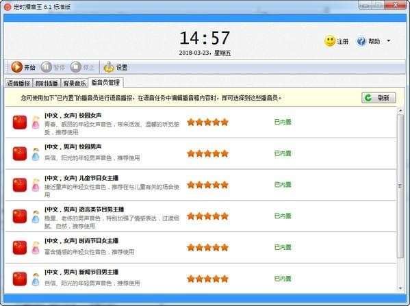 定时播音王是一款定时播音软件,拥有高保真的文字转语音功能,您只需将播音稿导入软件,设置播音时间和日期即可实现定时播音功能,并支持自定义背景音乐,支持多种声色的播音员,非常适合商场、超市、商店、学校、工厂、公司、餐厅、专卖店等场景下使用。