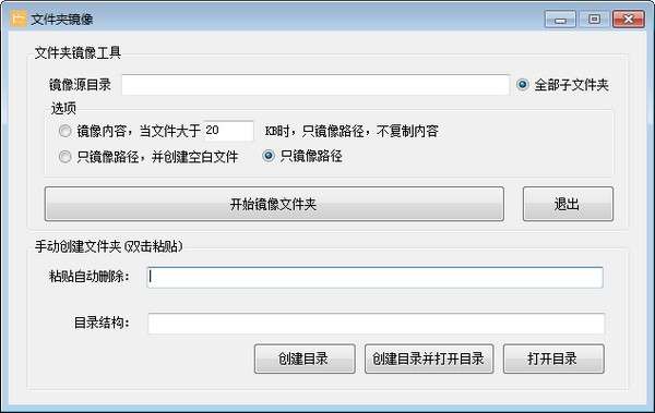 文件夹镜像工具最新版是一款应用广泛的文件管理软件,文件夹镜像工具官方版采用C#语言开发,完善吧友的功能,创建新文件、复制旧文件、创建文件夹的功能组合,镜像了目录结构,文件夹镜像工具最新版支持镜像内容,当文件大于20K时,只镜像路径,不复制内容,也支持只镜像路径,并创建空白文件。