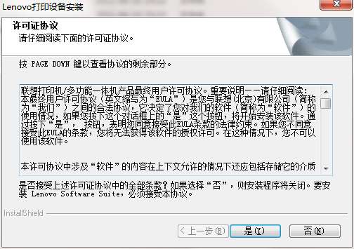 3.双击打开,进入联想m7400驱动软件界面,阅读安装许可协议,点击是