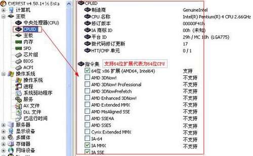 3、如果您想使用EVEREST Ultimate Edition硬件检测工具查看自己的CPU情况分析,您可以点击左侧的主板分类下的CPUID,一般建议查看CPUID,这样查看更清楚详细。支持的指令越多,CPU越好。