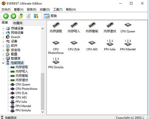 4、如果您想使用EVEREST Ultimate Edition硬件检测工具检测一下您的电脑性能怎么样,您可以将左侧的选项拉到最下面,点击性能测试,您可以检测您电脑的内存读取、CPU、FPU等相关性能测试。