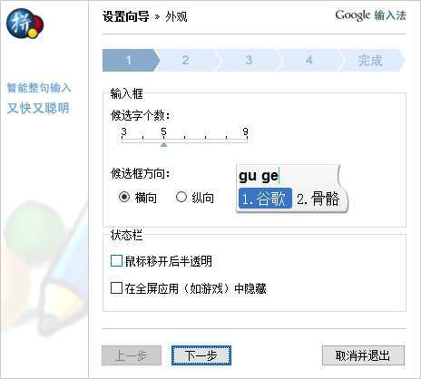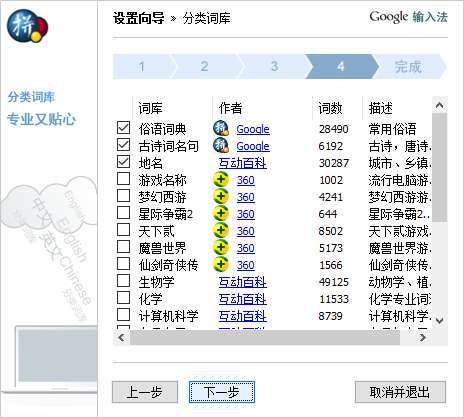 谷歌拼音输入法提供了很多专业的词库,使用者可以根据自己的需要勾选,但也不要全部选中,因为那样会把候选很多不常用的词组都排上来,反而降低了效率。也可以一个词库也不选中,使用一段时间之后,形成自己的输入模式,更靠谱一些→设置好之后点击下一步。