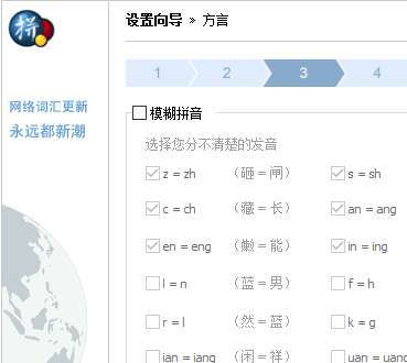 这里就是所谓的模糊音设置,尤其是对拼音中前鼻音还是后鼻音还搞不太清楚的人来说,不妨设置一下自己的使用习惯,也会提高输入效率的。一般而言,勾选z=zh之类的没有问题(前、后鼻音)。而是否勾选中间的 l=n 等选项,就因人而异了。因为有些地方方言中一些字母是读不出来,或者两者不分的,他们才需要这样设置→下一步。