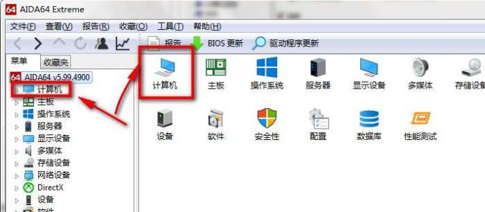 1、运行启动AIDA64软件,选择左侧的【计算机】或是右侧位置的【计算机】。