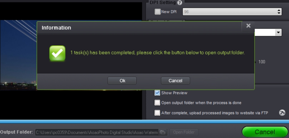 15、提示输出完毕,点击OK将保存位置打开,随后就可以查看AoaoPhoto Watermark处理的图片