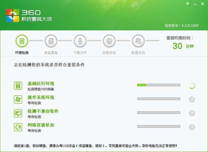 点击 “重装环境检测”按钮,程序将开始检测您的系统是否符合重装的条件: